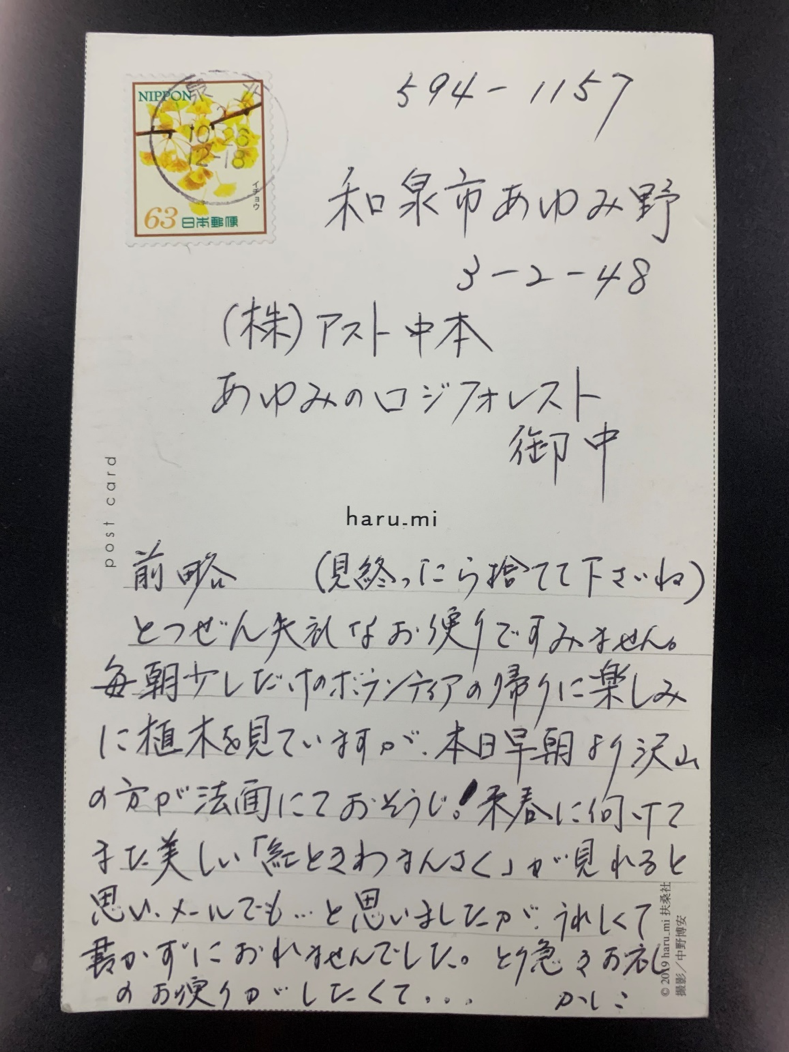 後日なんとびっくりしたことに法面の雑草抜きをご覧になっていたご近所のかたからこんな素敵なハガキを頂きました。