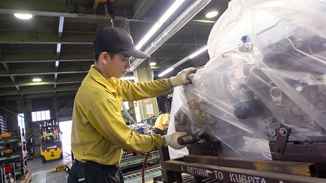 サビの発生を防ぐため、空気に触れないよう、機械製品をビニールで包み、輸出用パレットに載せ、ズレないようにボルトで固定していましたが、ごく稀に、ボルトが折れたり、緩んだりするという事態が発生。人によってボルトを締め付ける強さが異なり、締め付け力に過不足が発生していたことが原因でした。そこで、誰が締めても同じ締め付け力が保てるよう、基準を決め、それを徹底することにしました。